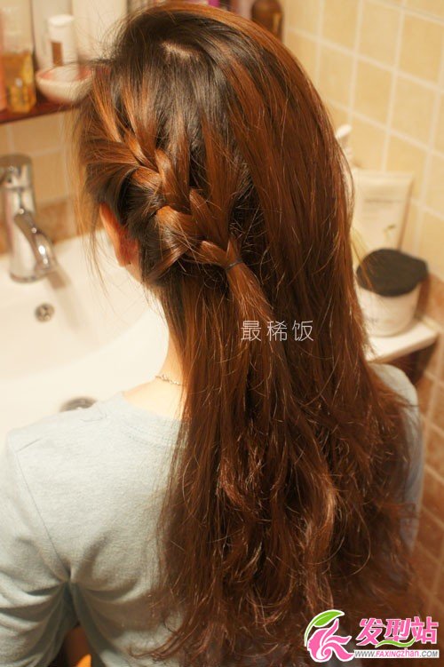 2邊都編制好后將左,中,右的三份頭發(fā)都夾到一塊,將中間的頭發(fā)用一字的橫夾別下。如圖