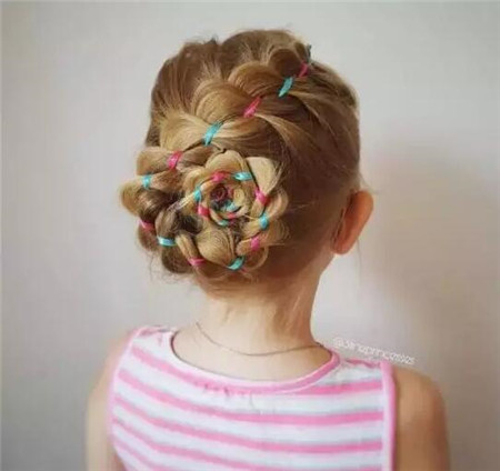 頭發(fā)盤(pán)起來(lái)的花型盤(pán)發(fā)造型,彩色緞帶宛如花蕊,甜美迷人。
