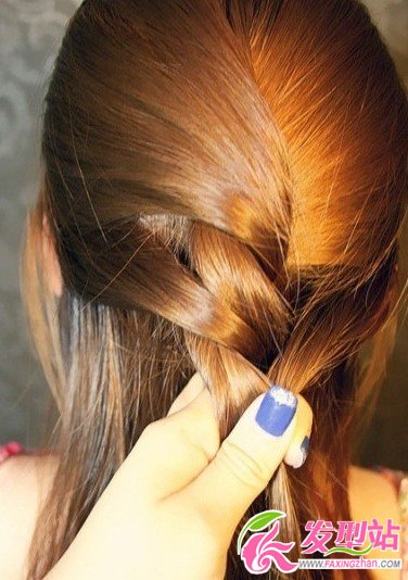在互疊兩次后,從左手取出一股頭發(fā)與其中一股合并。