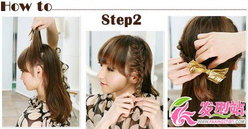 Step2:用加股編的方法編出兩條小辮子。即以三股編開(kāi)頭,然后每編一次就抓取底下的頭發(fā)添加進(jìn)去一起編,這樣辮子就會(huì)帖服在頭頂,不易松脫,但又有“松散”的感覺(jué)。