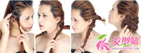 3、接下來,把對側(cè)的頭發(fā)用相同手法處理。之后,從腦后繞過先前一側(cè)編好的發(fā)辮,并全部纏繞在對側(cè)之上。