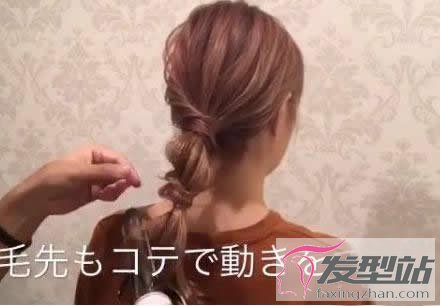 然后用其中一縷頭發(fā)做為綁帶,將頭發(fā)用皮筋綁定,并整理發(fā)頂打造出蓬松感。