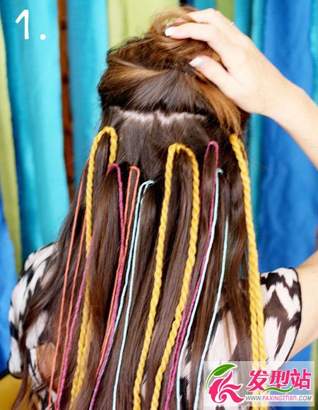 第一步:編織毛線。將五彩毛線編織成一股一股,然后分別系在一撮一撮的頭發(fā)上,然后再進(jìn)行編發(fā)。