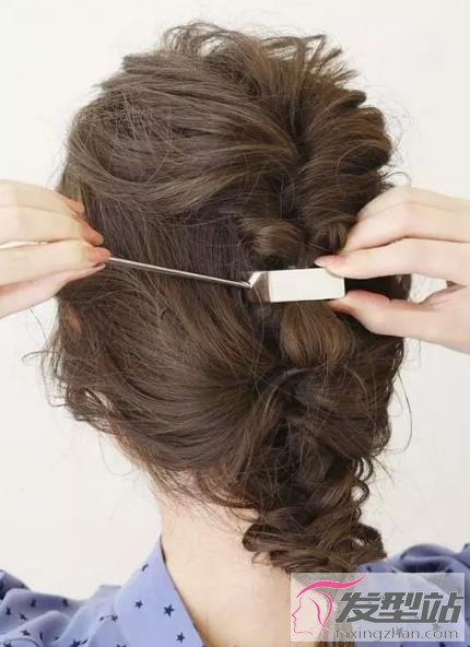 6、固定住魚(yú)尾辮,拉出發(fā)絲營(yíng)造蓬松自然的感覺(jué)。
