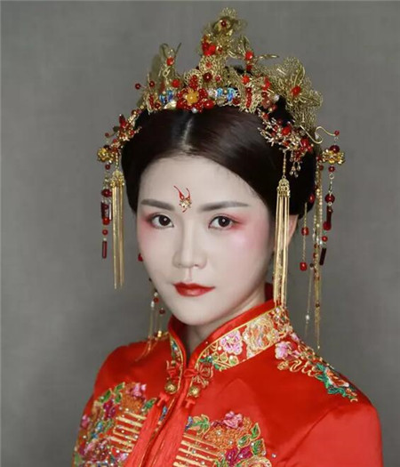 中式新娘發(fā)型,唯美大氣的鳳冠霞帔,搭配上精致的古典新娘妝容,花鈿裝更是打造出傾國傾城的輕奢感。