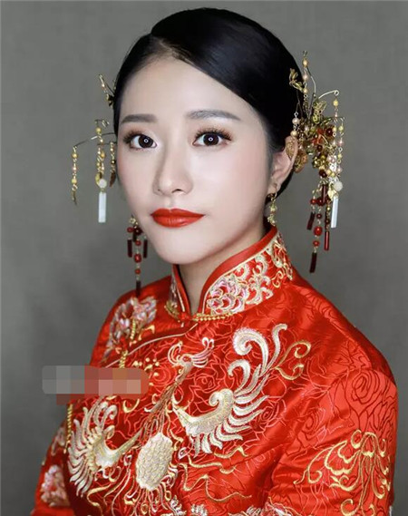中分新娘發(fā)型,適合飽滿額頭女生的一款。新娘子若選擇中式新娘發(fā)型,這款也是很上鏡且迷人的。