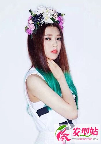 綠色漸變?nèi)景l(fā)不是容易hold住的顏色,Joy的中分帶著綠色大卷看上去略有些夸張。搭配上粉色花朵發(fā)圈,仿佛從熱帶雨林中走出來花仙子,充滿了生機(jī)。