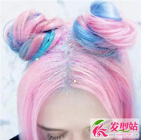 粉色搭配藍(lán)色款式的染發(fā),這種浪漫的發(fā)色,搭配上可愛(ài)雙丸子頭發(fā)型,時(shí)尚卡哇伊。