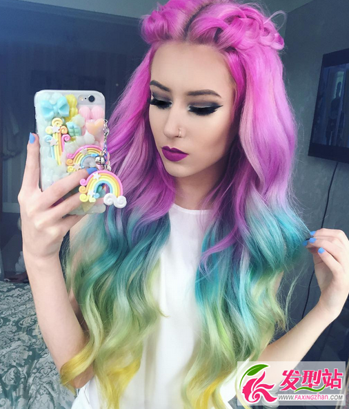 粉色漸變藍色到綠色最后變成黃色,完整的彩虹染,非常夢幻,卷發(fā)讓漸變染發(fā)顯得更加迷幻。