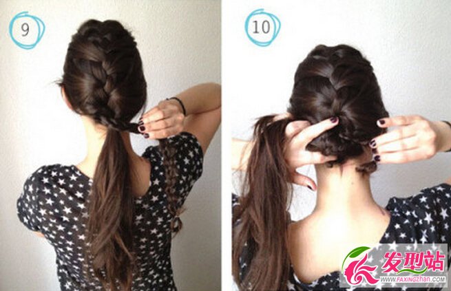 第九步,麻花辮向后繞;第十步,麻花辮纏繞蜈蚣辮,把蜈蚣辮的皮筋藏住。