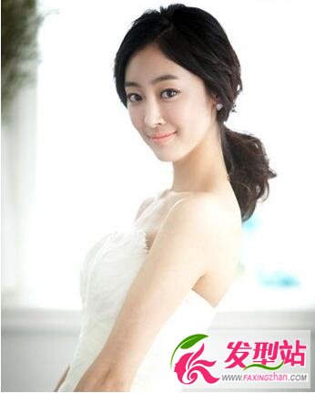 低馬尾太簡單不適合濃重的婚禮?那就錯(cuò)咯。這款簡單的低馬尾同樣扎出了甜美高貴的味道。劉海設(shè)計(jì)成蓬松的樣式,搭配扭轉(zhuǎn)的發(fā)束,頭型飽滿而富有質(zhì)感,帶上白色花飾,唯美高貴,兩鬢垂下的卷發(fā)也是女人味十足。