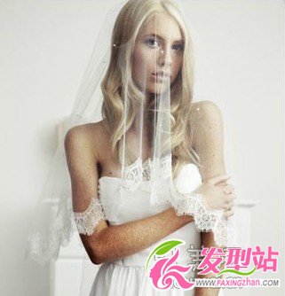 波浪式的蕾絲邊設計顯露動感,在微風吹拂下,點綴其上的少量珍珠隨著飄動的頭紗跳動起來,新娘也頓顯俏麗。裝飾中分卷發(fā)的效果很出色。