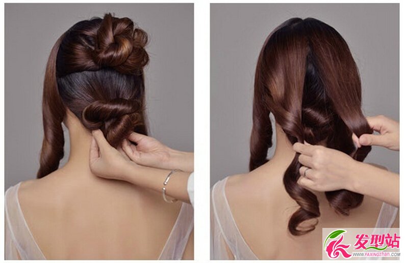 扭轉(zhuǎn)下面部分發(fā)束并結(jié)成一個(gè)發(fā)包,用發(fā)夾固定,把發(fā)面部分發(fā)束取下來(lái),分成左右兩份。