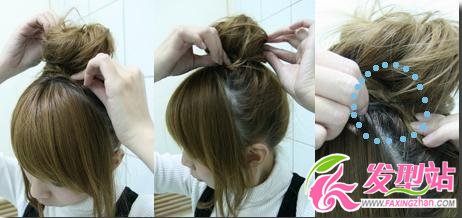 用右手抓住扭轉在一起的發(fā)尾,順勢繞在發(fā)圈上面,此時頭頂就會形成一個丸子,然后用左手去控制丸子形成的角度,可以拉松或拉緊。發(fā)尾繞到最后,用黑色發(fā)夾插入固定。