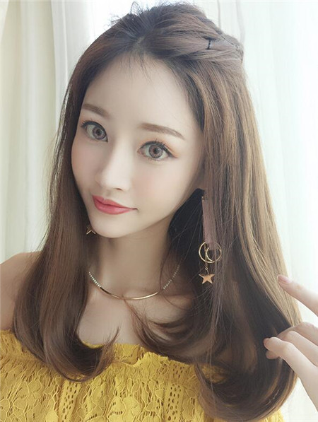 深棕色的發(fā)色和及腰梨花頭內(nèi)扣長發(fā)的搭配,制造文藝優(yōu)雅,亮片妝容的修飾,更是制造精靈似的精致女生。