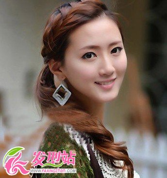 側(cè)分的劉海在頭上編制成三股辮一直編至后面的低扎馬尾上,然后扎在一起,馬尾垂在肩上顯得十分俏麗活潑,別致的方形鏤空耳墜更顯時尚感。
