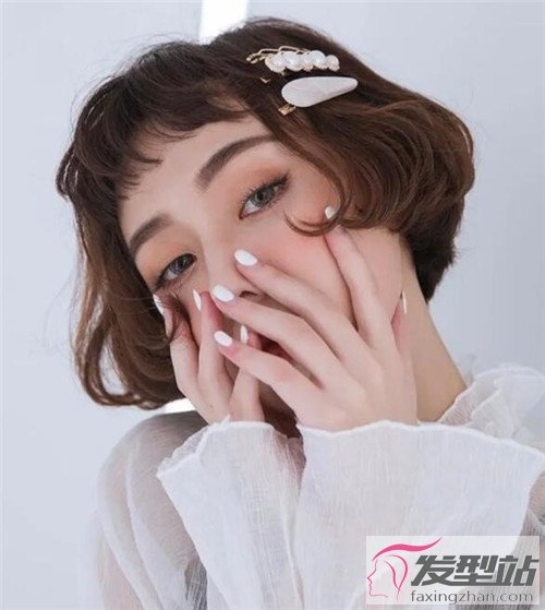 眉上劉海短發(fā),短發(fā)最佳剪裁長(zhǎng)度則在下巴位置,因?yàn)榭梢詫⒛阌怖实南掳途條,肉肉的側(cè)臉,全部遮起來(lái)。