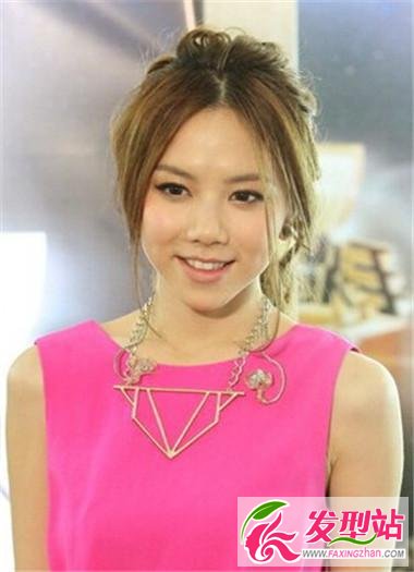 時尚的染發(fā)很是襯托膚色,將頭發(fā)盡顯精致的盤發(fā),中分劉海留出少許的發(fā)絲修飾兩頰的肉嘟嘟,顯得清爽大方又很可愛。