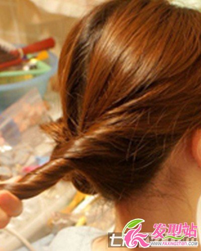 第七步:將擰好的發(fā)束按照圖示方向,圍繞已固定的發(fā)髻外圍開始纏繞。