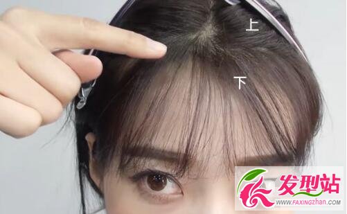 在修剪之前,先將瀏海分成上、下兩層(如下圖),建議上層可以厚一點,至於要修剪的下層則薄一點,免得到時後剪壞就更糟了!