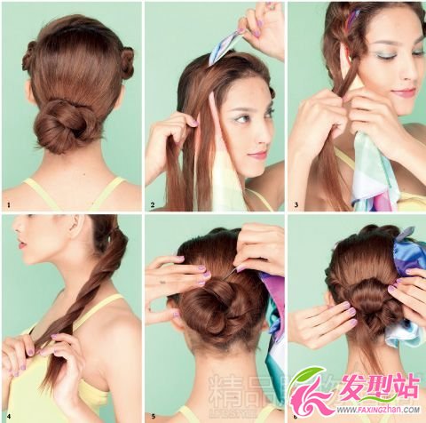 3.用絲巾當成其中一股辮子,將頭發(fā)編成一個多彩的三股辮。固定在腦后,多余的絲巾可以隨意地當成發(fā)飾固定在后側方。