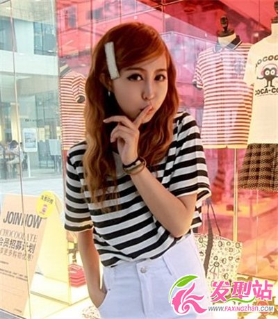 女生的長發(fā)從耳際的位置進行卷發(fā)處理,打造出蛋卷的發(fā)型,輕盈靈動的線條,自然的散開,無形之中增加了發(fā)量,斜分的劉海,用梳子梳向一邊,并用美麗的發(fā)卡固定住,起到了很好的減齡作用。