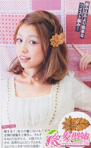 三七分開(kāi)的劉海在一側(cè)編起,耳側(cè)夾上花朵造型發(fā)夾,發(fā)飾的顏色和發(fā)色很搭