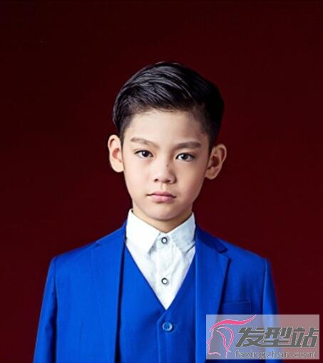 這款短發(fā)是輕盈的剪裁,露額造型大方得體,頂部頭發(fā)打造出蓬松的效果,穿上西裝,從小就是潮男。