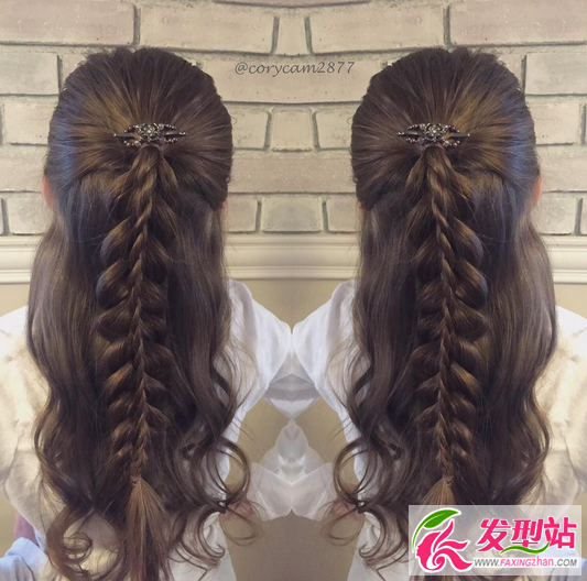 先扎好半扎發(fā),然后半扎發(fā)中間抽出一束比較少的先固定到上面,然后把剩下的半扎發(fā)編成寬版辮子,抽出的發(fā)束編成扭轉麻花辮然后用發(fā)夾固定在寬版辮子中間。