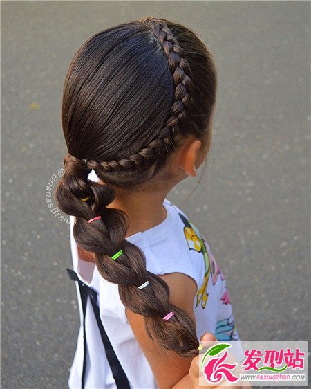 最新小女孩發(fā)型,劉海后梳編織麻花辮,打造成天然的發(fā)箍,斜編的劉海和剩下的頭發(fā)綁扎,馬尾分成三部分并選一股編麻花,和其余兩股交織。