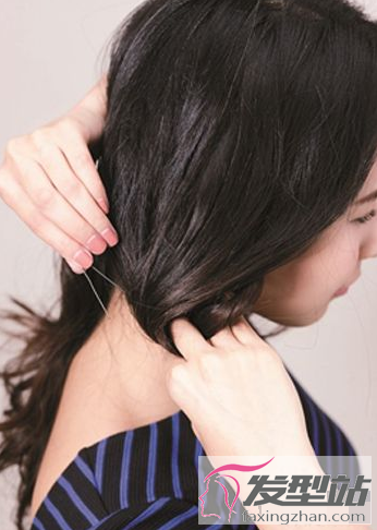 向內(nèi)凹藏入后方頭發(fā)內(nèi),并用夾子固定。