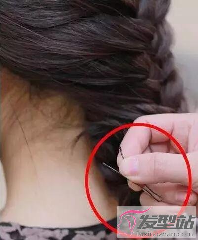 第六步:最后將兩側編好的三股辮藏到之前的大辮子下面,同樣是用小夾子固定好。