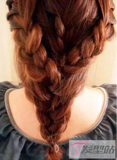 第二步:同上面一款發(fā)型相同,將這個三股辮編到發(fā)尾,期間不斷的從旁邊去頭發(fā)往里面加。