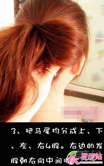 3.把馬尾均分成上、下、左、右4股,右邊的發(fā)投朝右向中間收