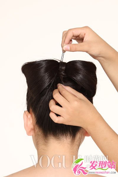 6.將已經(jīng)預(yù)留好的頭發(fā)從蝴蝶結(jié)中間纏繞。