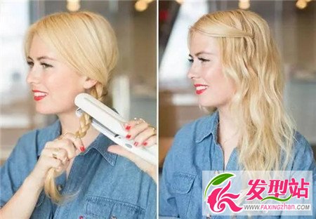 步驟二:接著只需用上直發(fā)板,把麻花辮從上到下均勻的燙一下,把皮筋送掉,用手指撥開發(fā)束,最后噴上定型噴霧,就可變卷發(fā)。