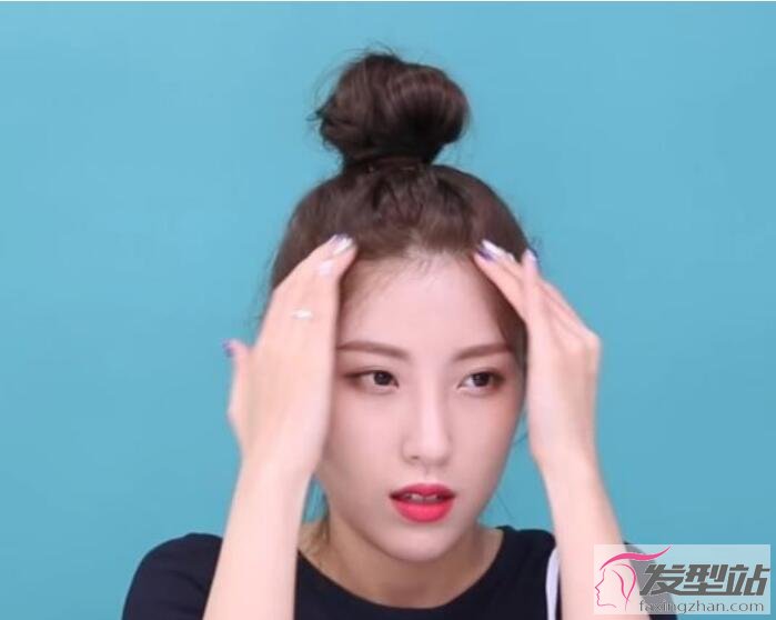 接著就是將整個(gè)辮子,以發(fā)飾為中心的繞出丸子頭,接著再用另一個(gè)發(fā)圈固定!
