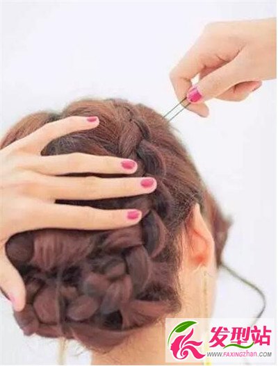 步驟三:用發(fā)圈左右束起余下的頭發(fā),交叉穿過上面固定住的麻花辮,然后自然蓬松地盤起。