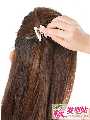 step2:將右耳朵上的頭發(fā)和頭頂上的頭發(fā)扭卷,用一個夾子固定住。