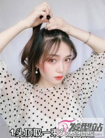 1、在頭頂處取一束頭發(fā)扎起來(lái),其他發(fā)絲自然垂放;