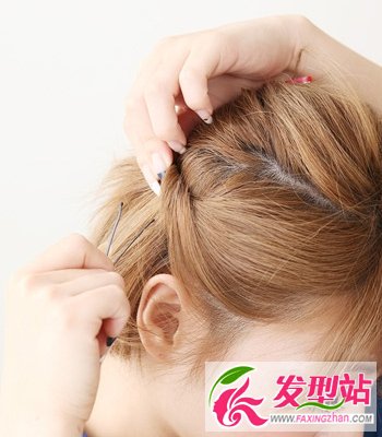 然后取出右側(cè)耳朵附近的頭發(fā)扭轉(zhuǎn)后固定在耳后。