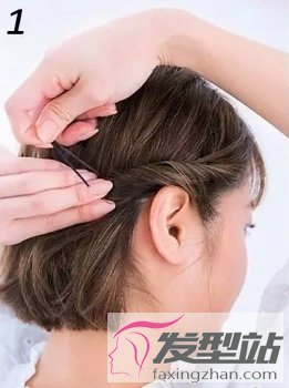 step 1:先抓取一側(cè)的頭發(fā),向外扭轉(zhuǎn),扭轉(zhuǎn)過程中,接著抓取耳側(cè)的頭發(fā)加入,一起朝一個(gè)方向扭轉(zhuǎn),中間需要借助一兩個(gè)一字夾固定;