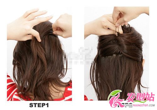 STEP2:將綁好的麻花辮往后抓,用橡皮筋綁在一起。然后用小黑夾在橡皮筋的地方將發(fā)辮和相面的頭發(fā)固定在一起。
