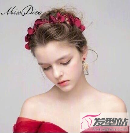 點(diǎn)綴紅色花瓣的盤發(fā)更具芬芳?xì)庀ⅲ嵘w美感。