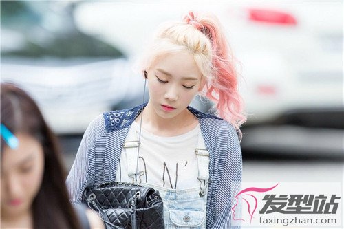 很有個性的一款卷扎發(fā),將所有的頭發(fā)全部扎成一個馬尾,整個人看起來利落又有型,搭配粉色系的染發(fā)顏色,靚麗又奪目。