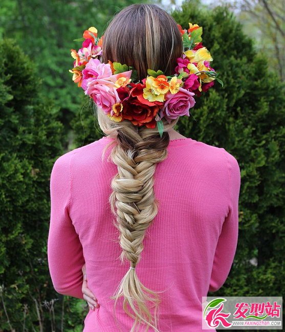 魚尾辮和花環(huán)是絕配,加上鮮艷的花色,充滿熱情和童真的氛圍。