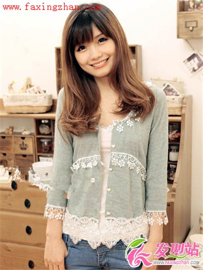 甜美的笑容與自然披肩的中長(zhǎng)發(fā)相得益彰,齊劉海增添蘿莉感,奶茶色發(fā)色突顯童顏魅力。