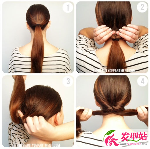 1、扎一個中低馬尾,最上面用手撥開一個縫,頭發(fā)穿過之后拉緊;