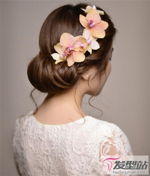 韓式的盤發(fā)比較簡單且有女人味,沒有復雜毛躁的線條,鮮花可簡單的點綴在耳側。