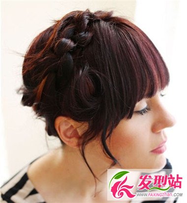 酒紅色挑染的或者是棕色挑染很適合這款編發(fā)盤發(fā),劉海的鬢角卷燙出弧度,頭頂上麻花辮纏繞的編發(fā)盤發(fā)是日系可愛的森女風(fēng)格,起到了減齡修顏的作用。